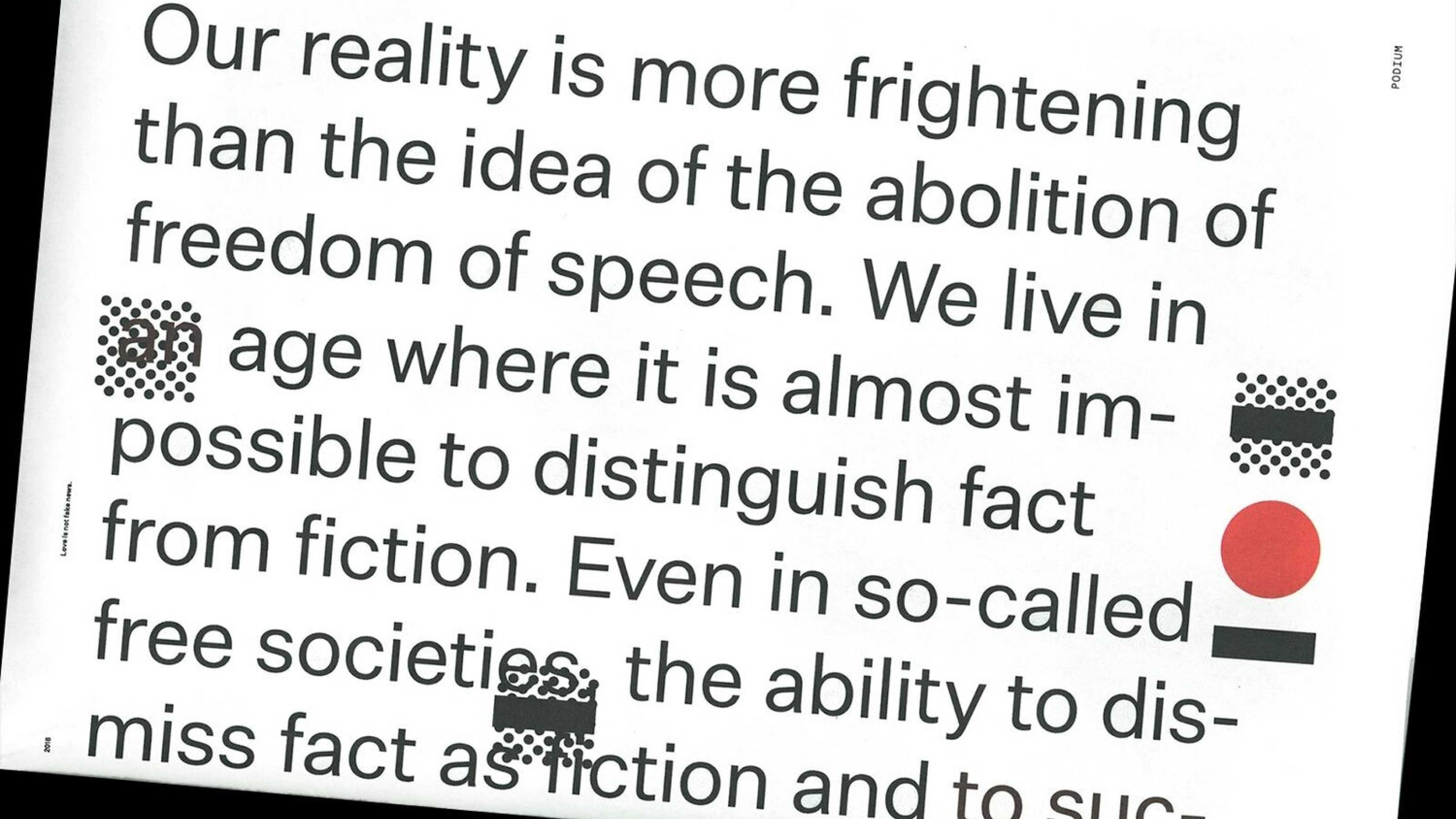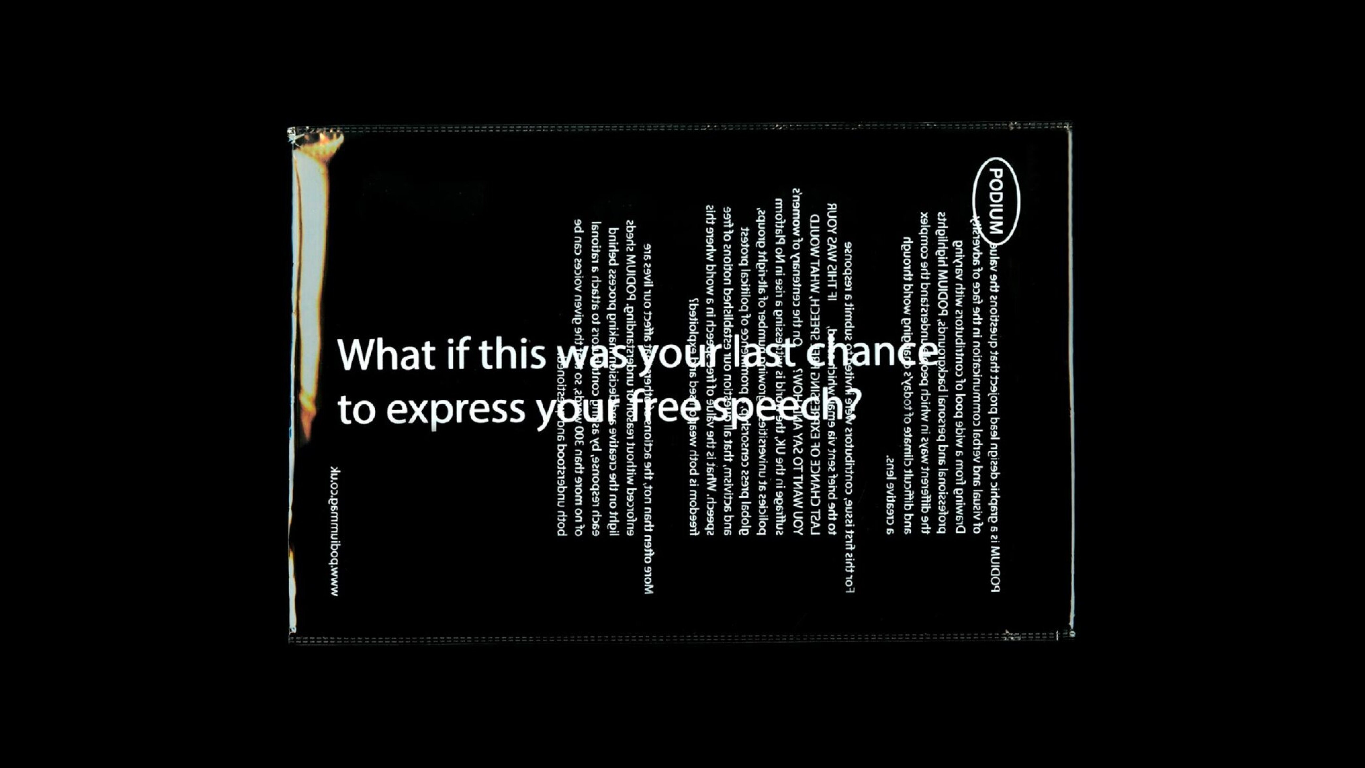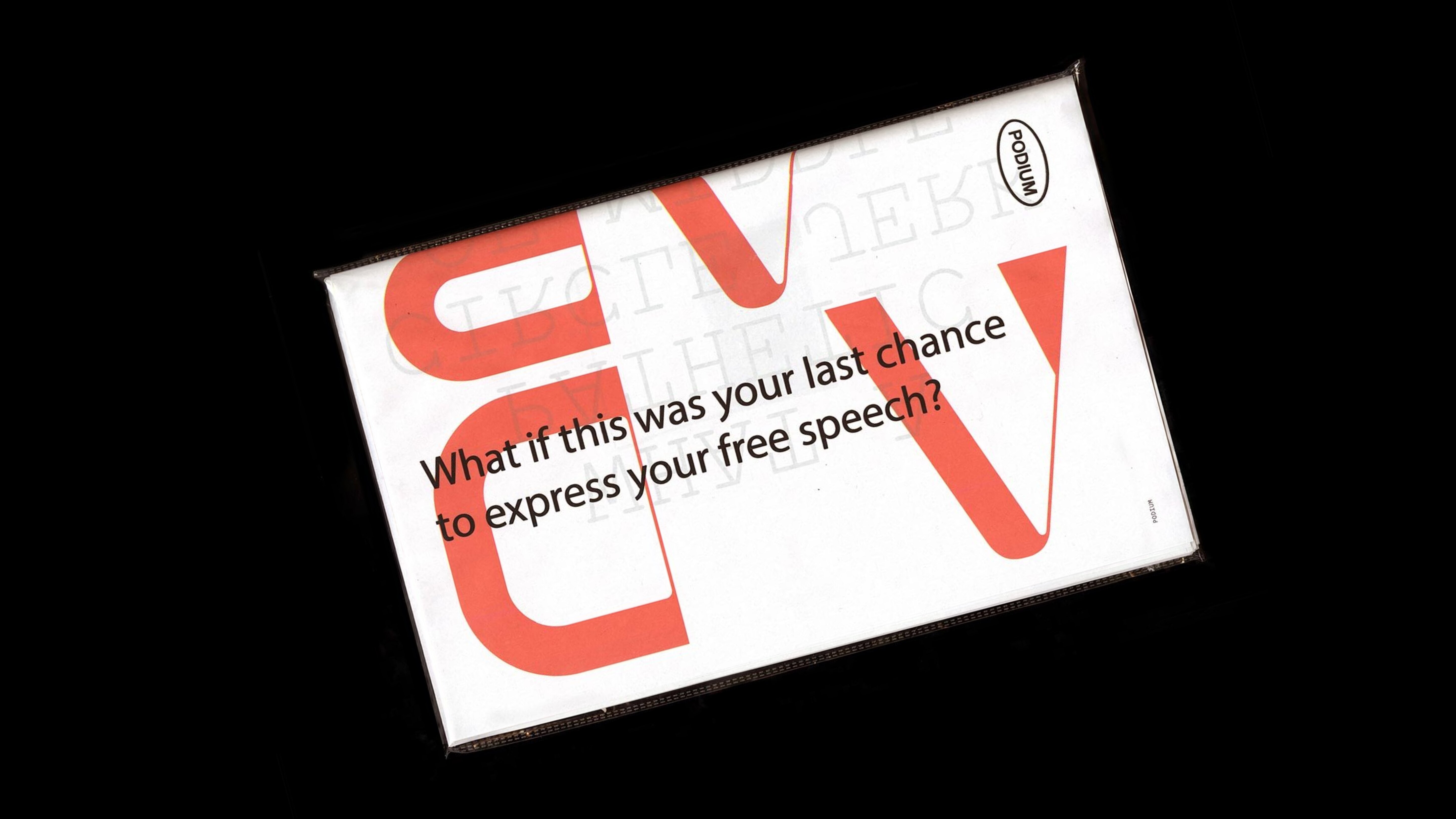Created and published by Royal College of Art students, PODIUM highlights diverse perspectives on today’s complex and challenging climate. Contributors from varied backgrounds responded to the brief: If this were your last chance to express free speech, what would you want to say, and how? The project explores the value of free speech in a world where this freedom is both weaponized and exploited.